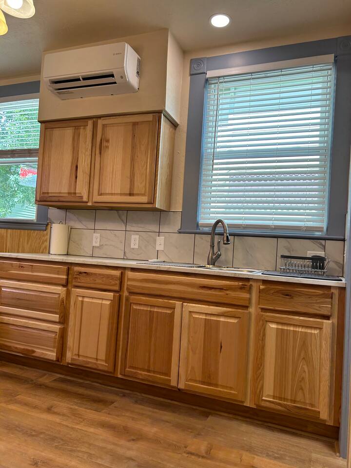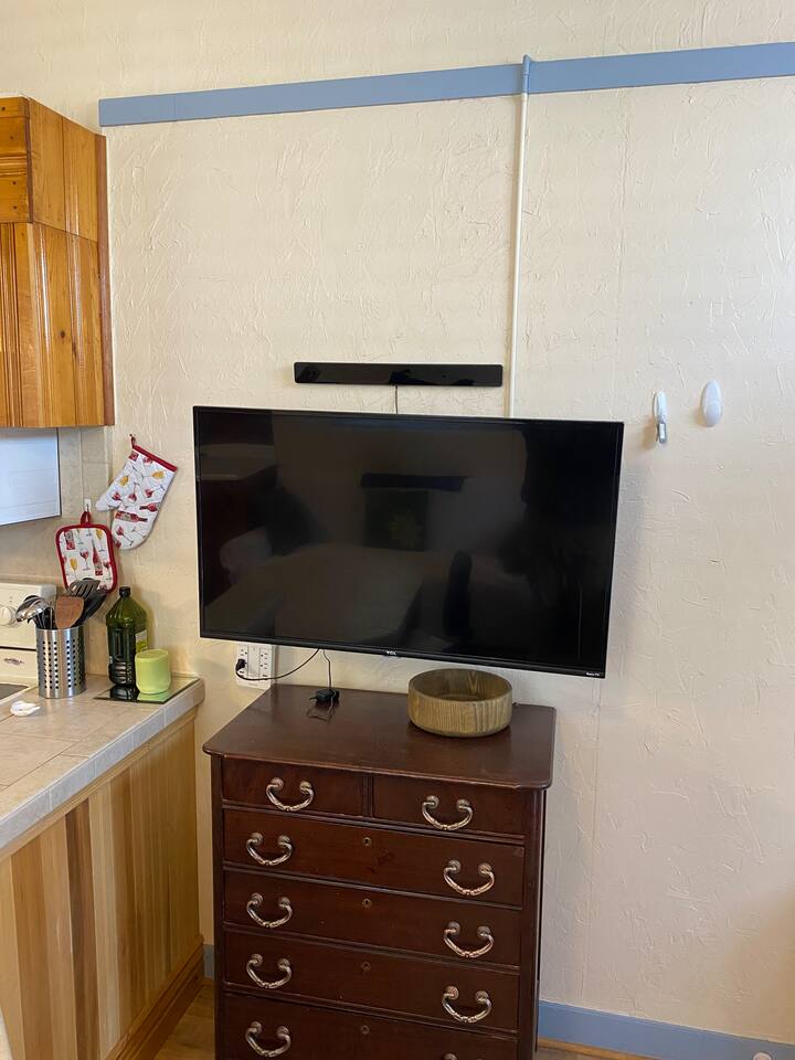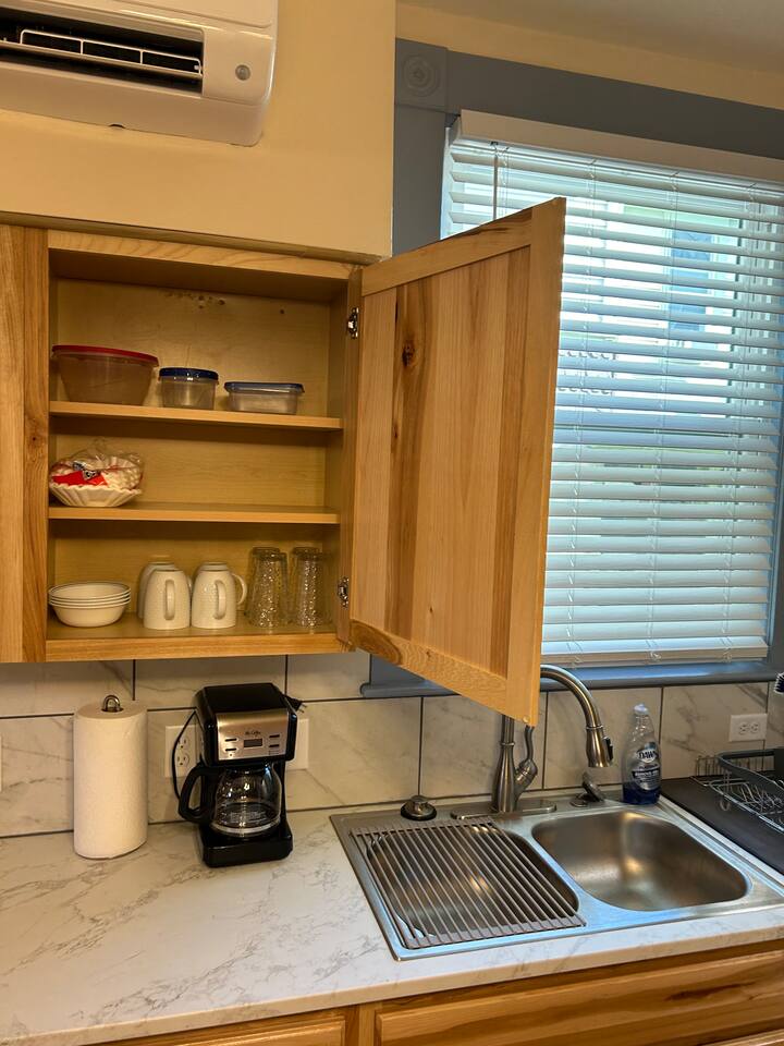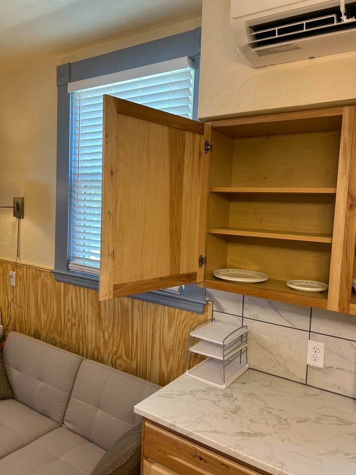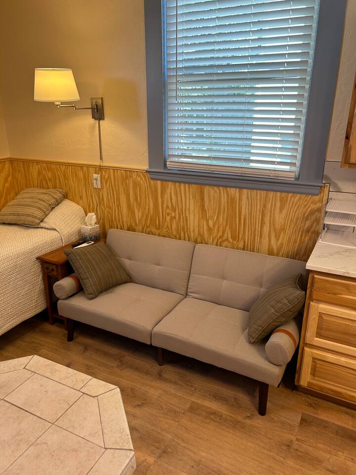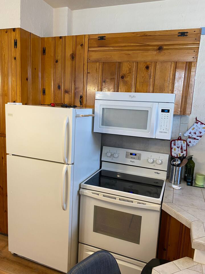 Fully furnished & fully equipped with linens, towels, and house wares. High speed internet, WIFI. Private entrance with small, fenced patio area with table and chairs. Full size refrigerator/freezer. Full size stove & oven, microwave, double sink. Private bathroom with standard size shower, toilet and vanity area. Comes with a twin XL size bed 38" wide by 80” long. Small couch and built in countertop table. Private locking mailbox for each apartment, available for longer stays.